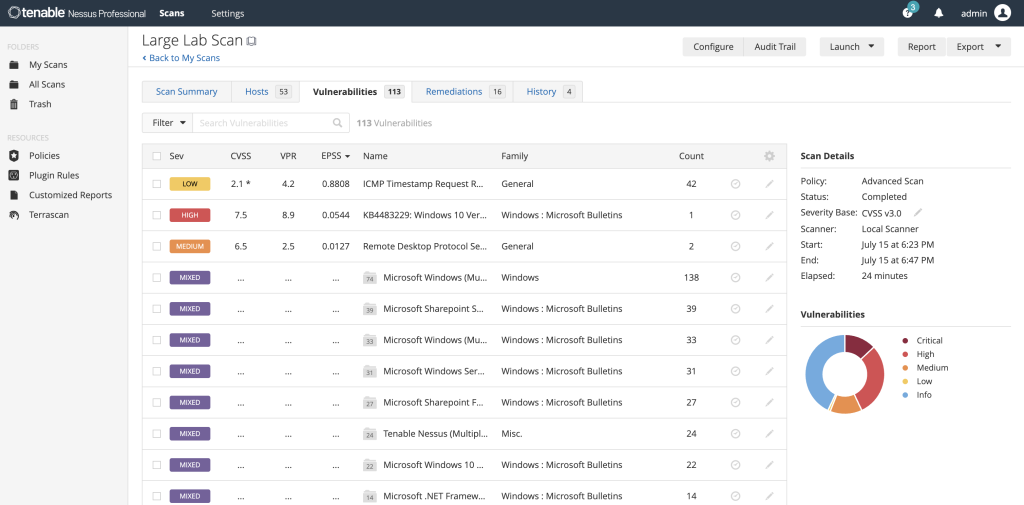 凭借市场先进的覆盖范围,Nessus 对每个漏洞都了如指掌。凭借 Nessus 所提供的强大功能,您可以通过利用各种输入信息,包括 EPSS、CVSS 和 Tenable VPR 对漏洞进行优先级分析,然后对重要的威胁进行分类并加以解决。